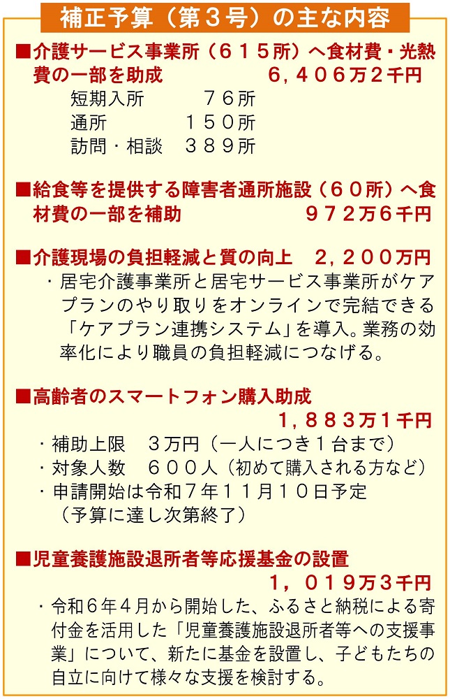 高齢者のデジタルデバイド(情報格差)解消および健康アプリ(今年10月導入予定)を含む区の行政デジタルサービスの利用促進を図るため、高齢者を対象にスマートフォン購入費用を助成する経費も補正予算に計上されました。