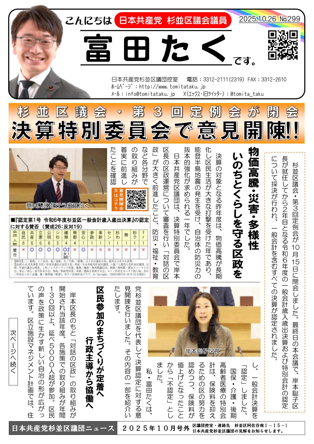 杉並区議会・第3回定例会が閉会 決算特別委員会で意見開陳!!(区政報告ニュース299号)