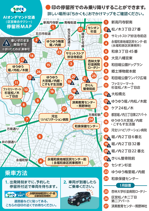 党区議団が求めてきた交通不便地域の解消に向け、岸本区長のもと堀ノ内・松ノ木地域で「AIオンデマンド交通」の実証実験が開始されました。また、実証実験の期間が本年(2026年)12月末まで延長されました。