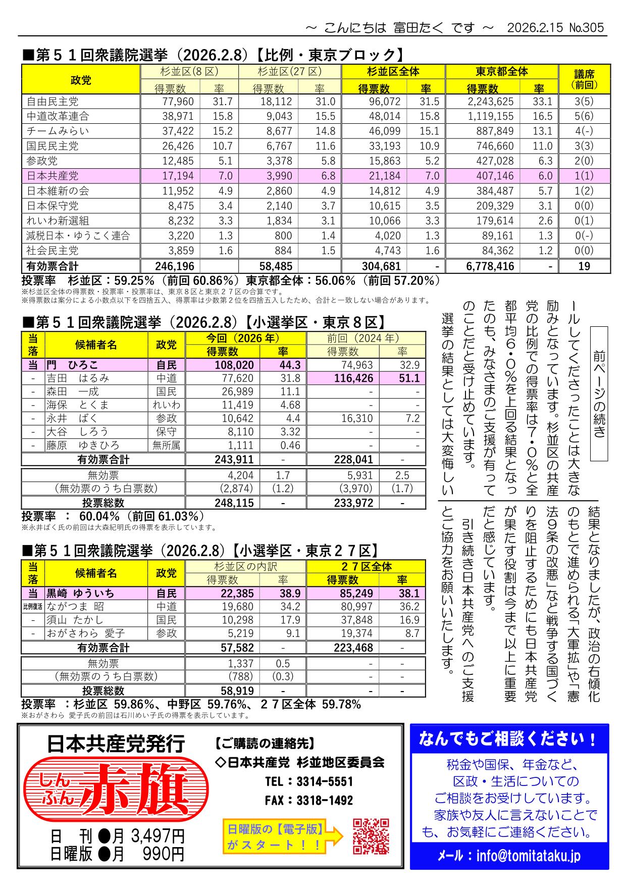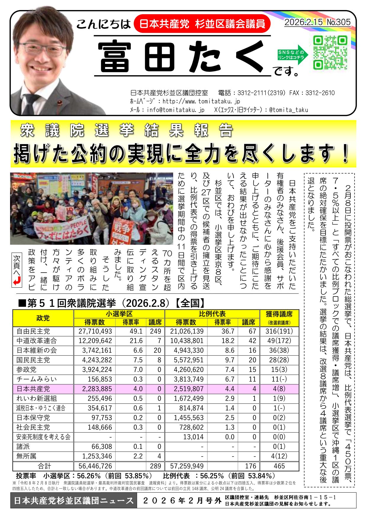 また、東京都全体では日本共産党は、改選前19議席から5議席後退し14議席の獲得にとどまりました。ご期待にこたえる結果が出せなかったことに対し、お詫びいたします。引き続き、掲げた公約の実現に全力を尽くすとともに、7月の参議院選挙でさらなる飛躍を目指し、奮闘する決意です。